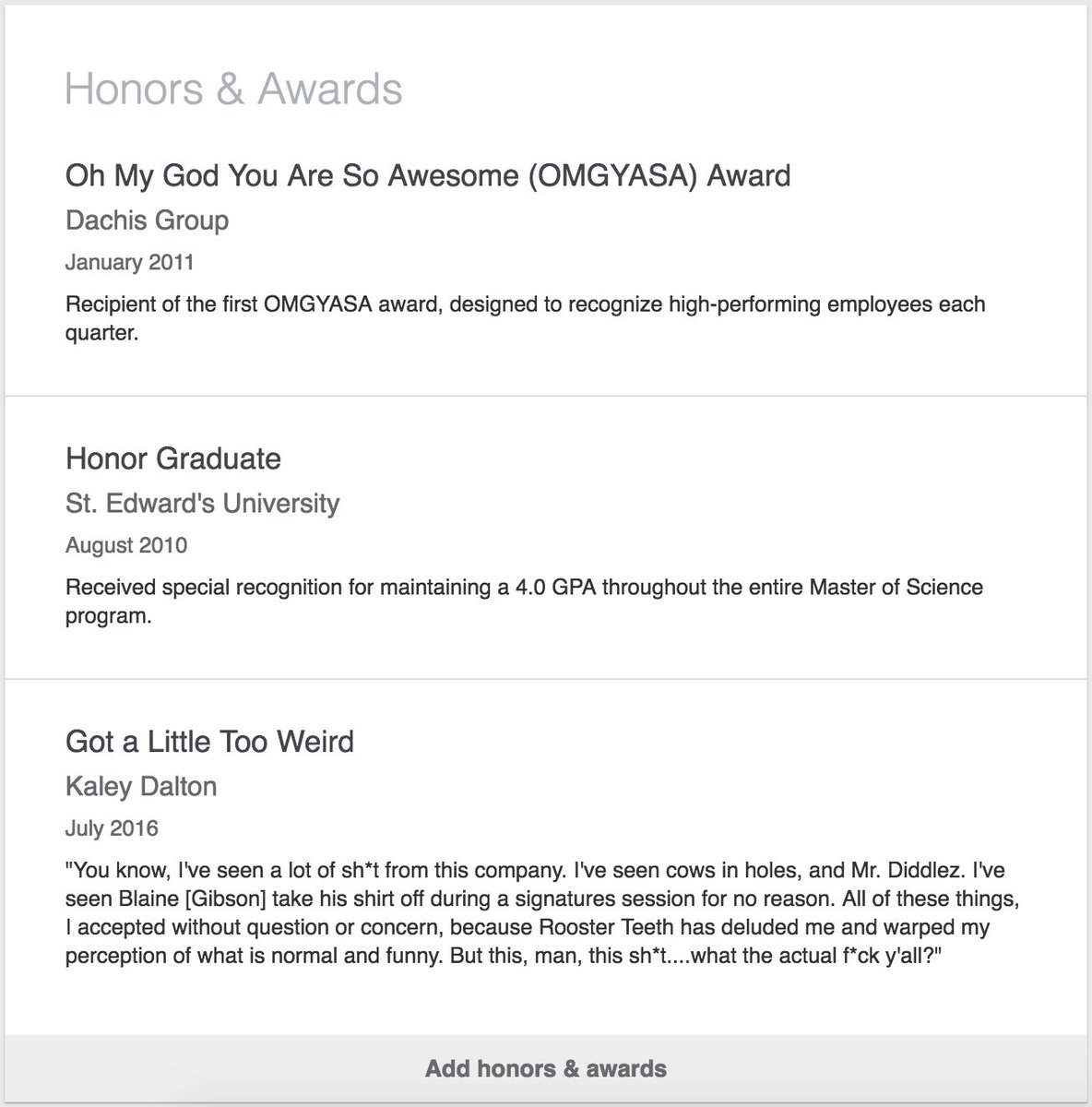 Dec 03, 2020 · 1. Many people don't keep a list of the honors and awards they have received, and when it finally comes time to list them, they simply can't. Ask a friend for less formal events. Talk with the organizer for more formal events — they often take videos. In this 2019 video, linkedin trainer teddy burriss uploads a file, which is exactly what you will be doing. See full list on avidcareerist.com See full list on avidcareerist.com Please don't hesitate to invite me to connect on linkedin at donna svei, executive resume writer. Watch him, then go for it. What is the honors and awards section on linkedin? The honors & awards section of your linkedin profile is the area to enter any honors and awards you earned throughout your career. See full list on avidcareerist.com The more i know about my readers, the better i can make my blog.